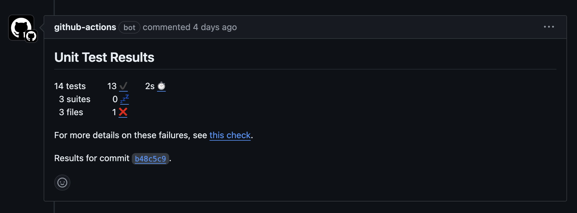 빌드 검증이 끝났으면 테스트 코드를 실행할 차례입니다. 먼저 명령어를 이용하여 테스트 코드를 실행해 주고 그 결과를 PR comment로 달아줍니다. PR comment를 달 때는 EnricoMi의 publish-unit-test-result-action@v1을 사용하였습니다.