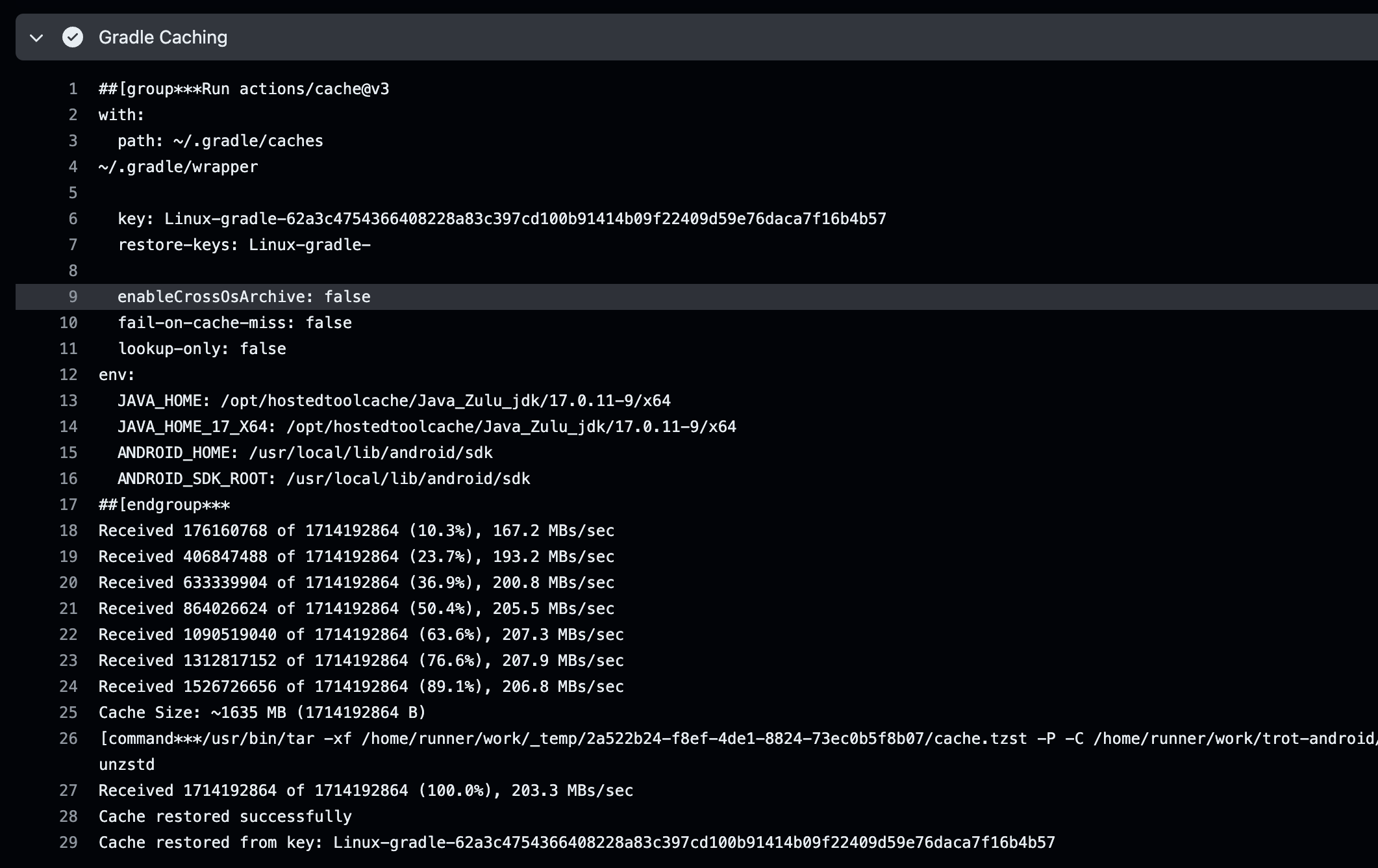 저희 프로젝트에는 난독화 코드가 적용되어 있어 gradle 빌드에 많은 시간이 소요되고 있었습니다, 이를 해결하고자 CI실행 시 Gradle캐싱을 통해 빌드 시간 단축을 시도하였습니다.